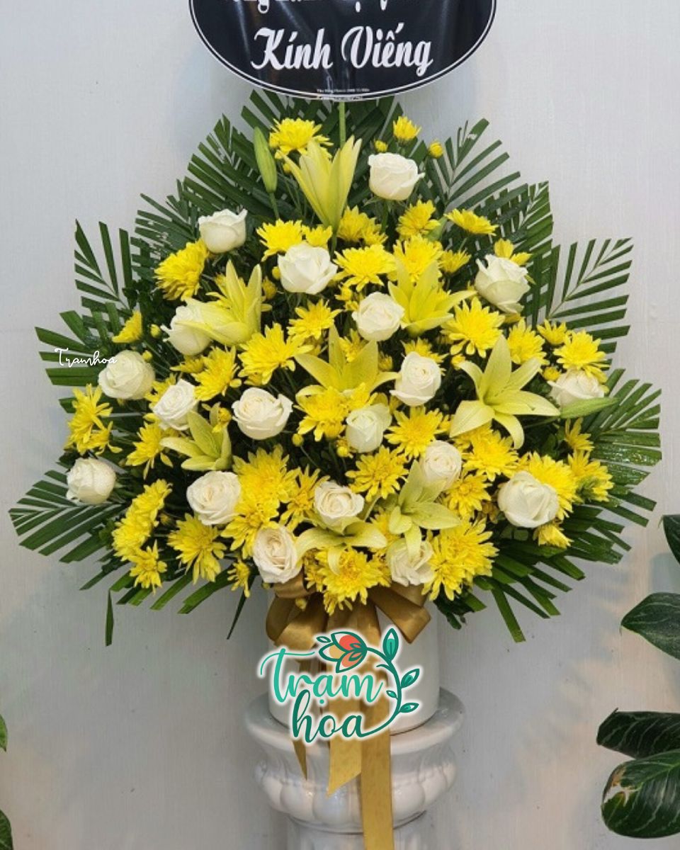 Niệm Ân – CB222 là lẵng hoa chia buồn để bàn thiết kế nhỏ gọn, tinh tế, mang theo sắc trắng – vàng trang nhã từ hoa hồng trắng, cúc vàng và điểm thêm hoa ly vàng. Mỗi bông hoa như lời tri ân sâu sắc gửi đến người đã khuất, thể hiện lòng biết ơn và tiếc thương chân thành.