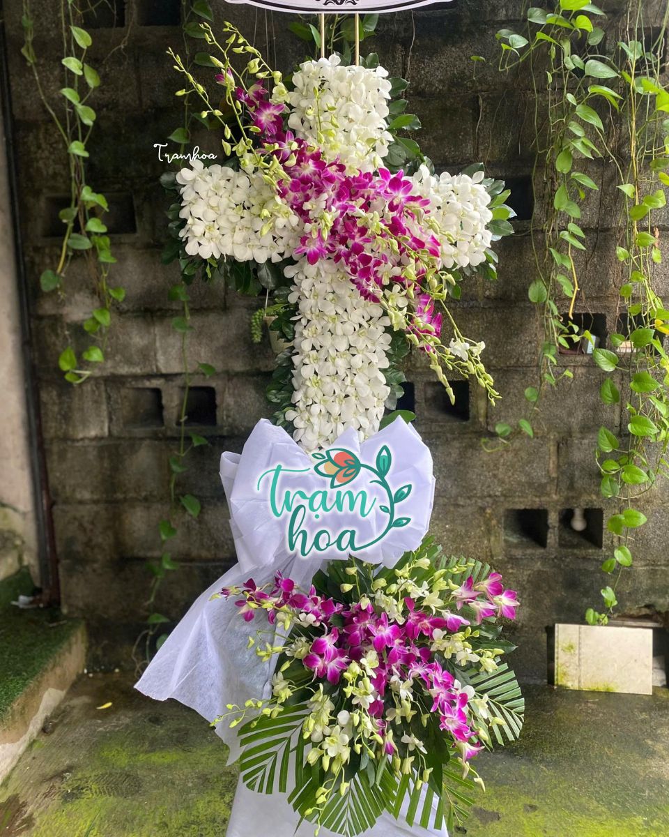 Hai tầng hoa được sắp xếp hài hòa, tạo sự cân đối và trang trọng. Thánh giá trung tâm là điểm nhấn nổi bật, được kết từ những cánh hoa lan thái trắng tinh khôi, điểm xuyết thêm hoa lan tím tạo chiều sâu thị giác và cảm xúc.