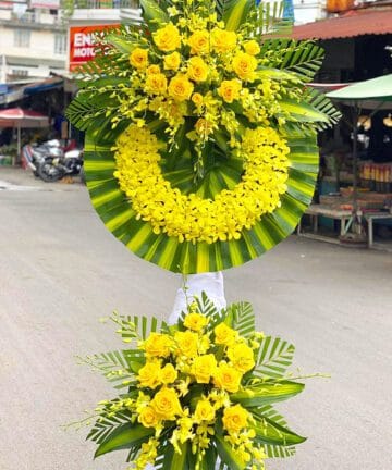 Trong văn hóa tang lễ, vòng hoa tang vàng không chỉ thể hiện sự tiếc thương mà còn mang ý nghĩa tưởng nhớ sâu sắc và cầu chúc linh hồn người đã khuất an nghỉ. Màu vàng là biểu tượng của ánh sáng, sự giải thoát và hồi sinh, đặc biệt phù hợp khi viếng đám tang người lớn tuổi – những người đã có một cuộc đời viên mãn, đáng kính trọng.